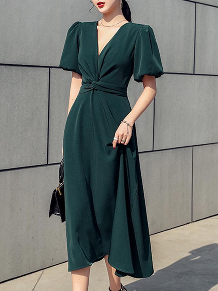 White V-neck Long-sleeved Simple Dress In The Long Section