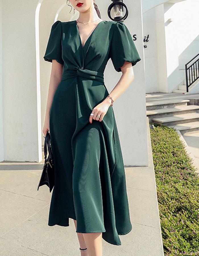 Elegant SATIN Wrap Chest Sleeveless Mid Length Evening Dress