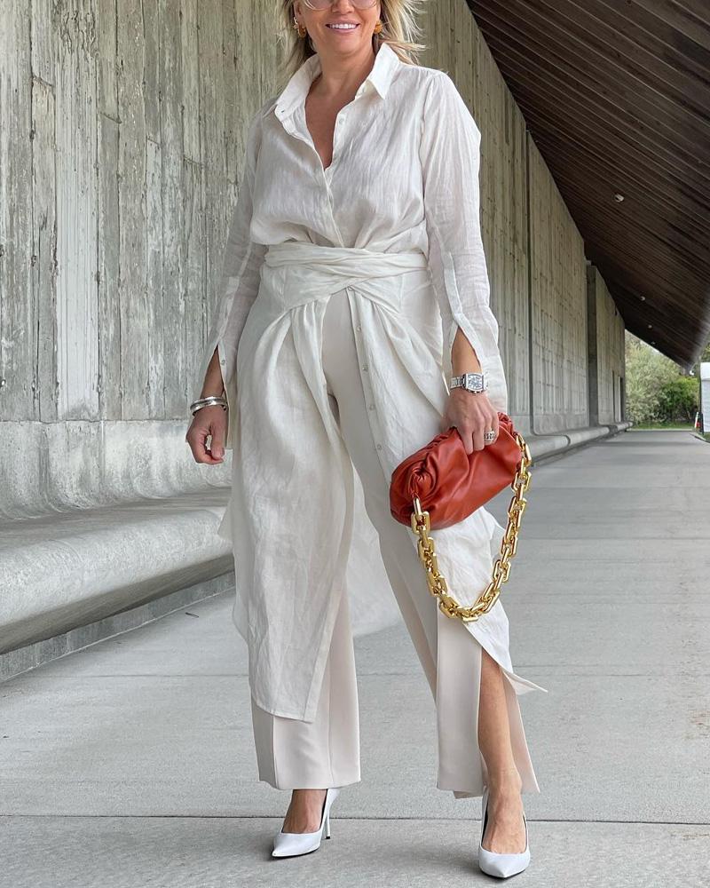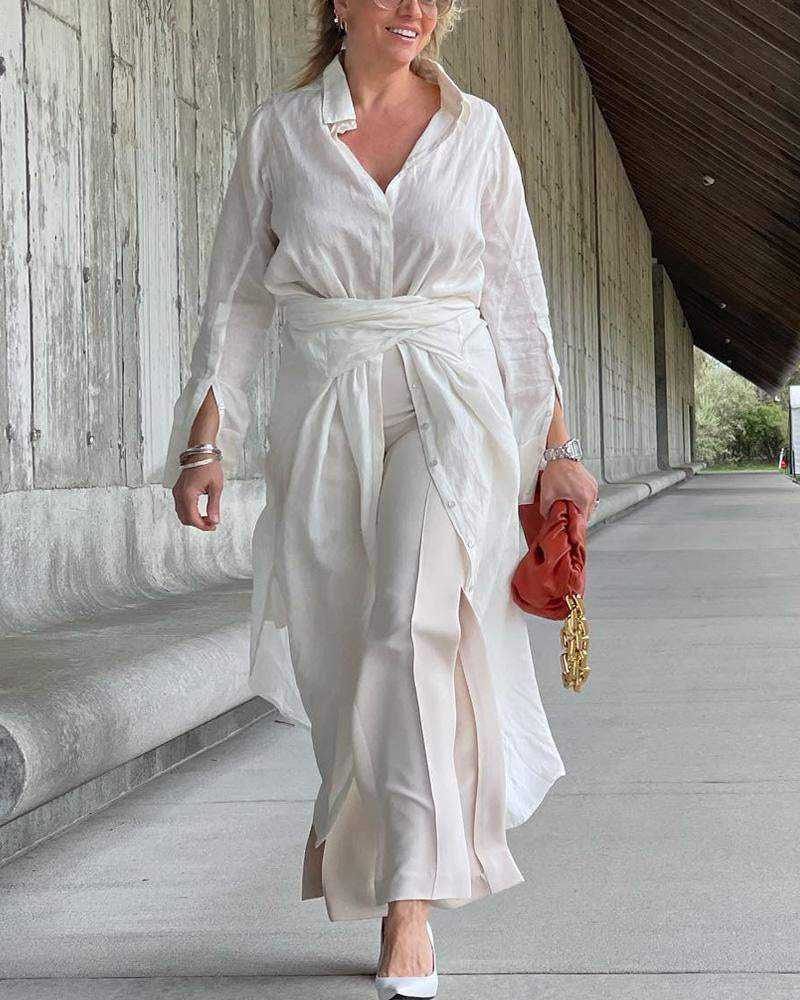 White V-neck Long-sleeved Simple Dress In The Long Section