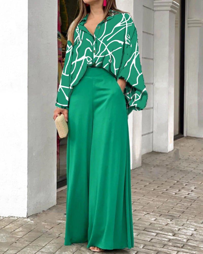 Casual Print Shirt & Wide Leg Pants Two-Piece Set