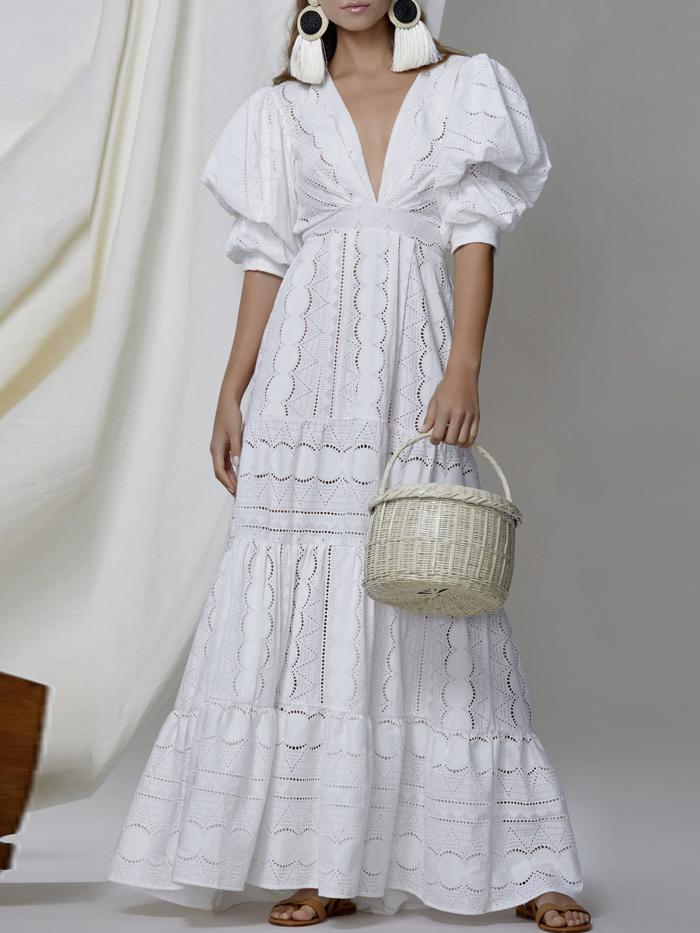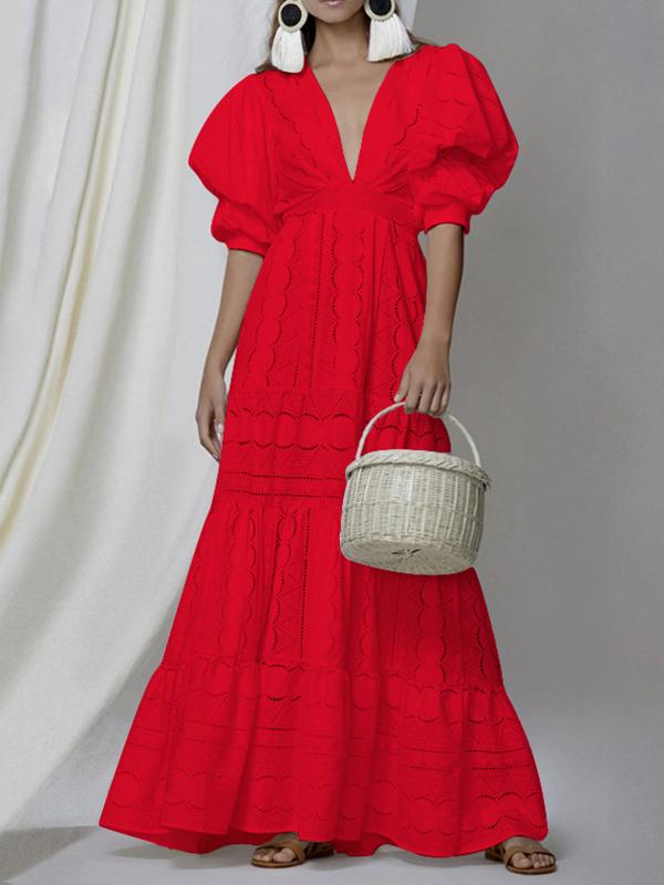 Deep V Puff Sleeve Lace Hollow Dress