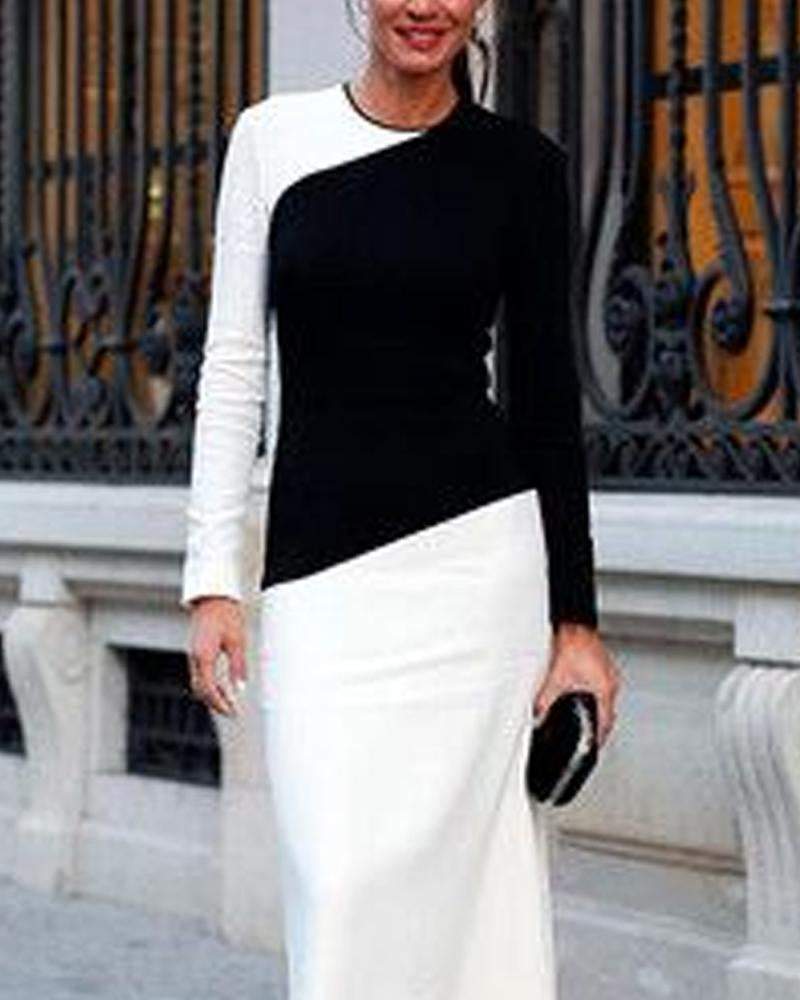 Elegant Round Neck Slim Fit Color Block Long Dress