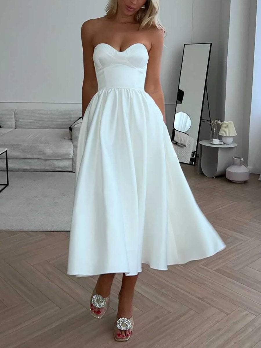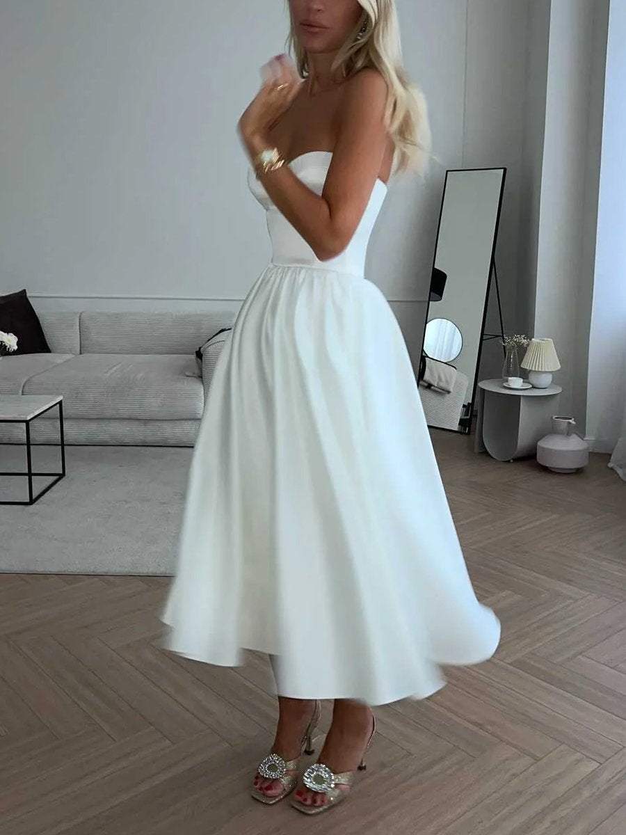 Elegant SATIN Wrap Chest Sleeveless Mid Length Evening Dress