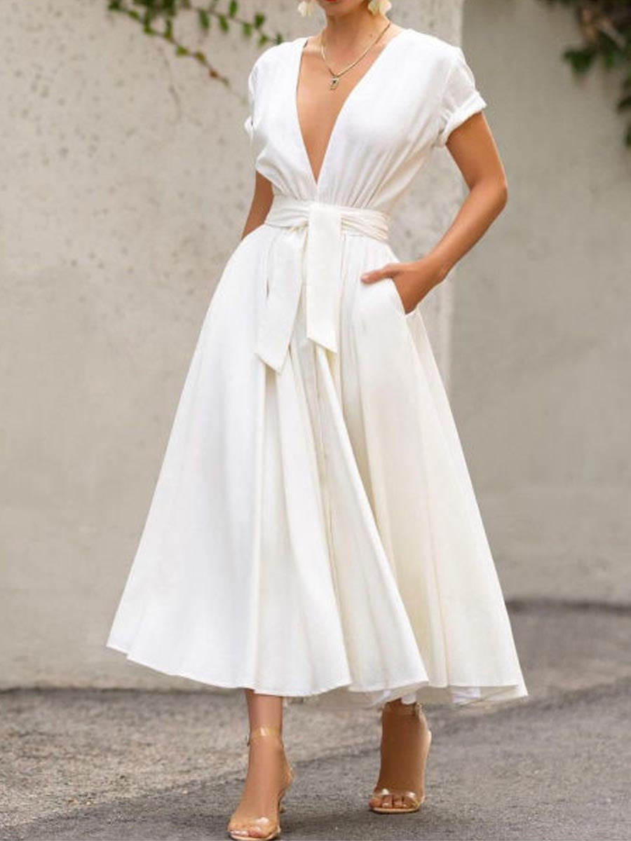 White V-neck Long-sleeved Simple Dress In The Long Section