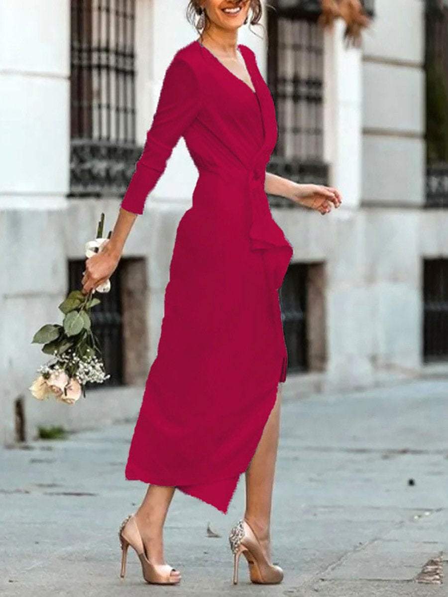 Elegant V-Neck A Long Sleeve Midi Dress