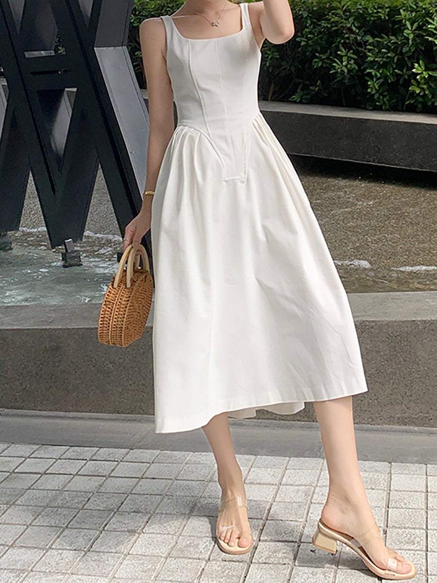 White V-neck Long-sleeved Simple Dress In The Long Section