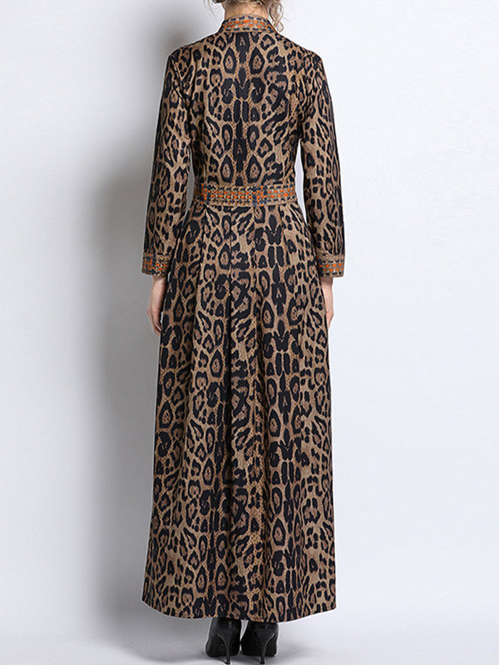 Fashion Leopard Print Lapel Long Sleeve Dress