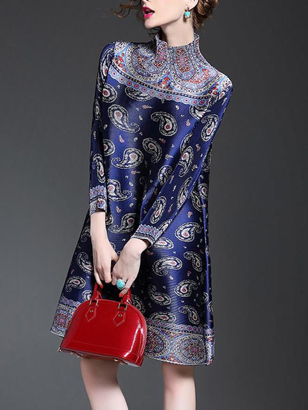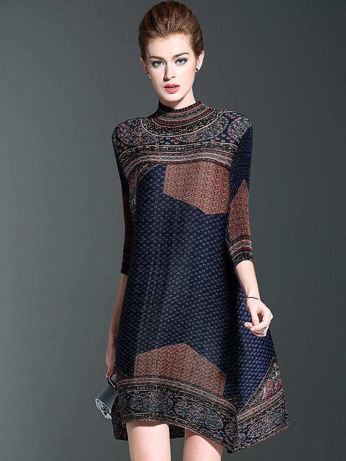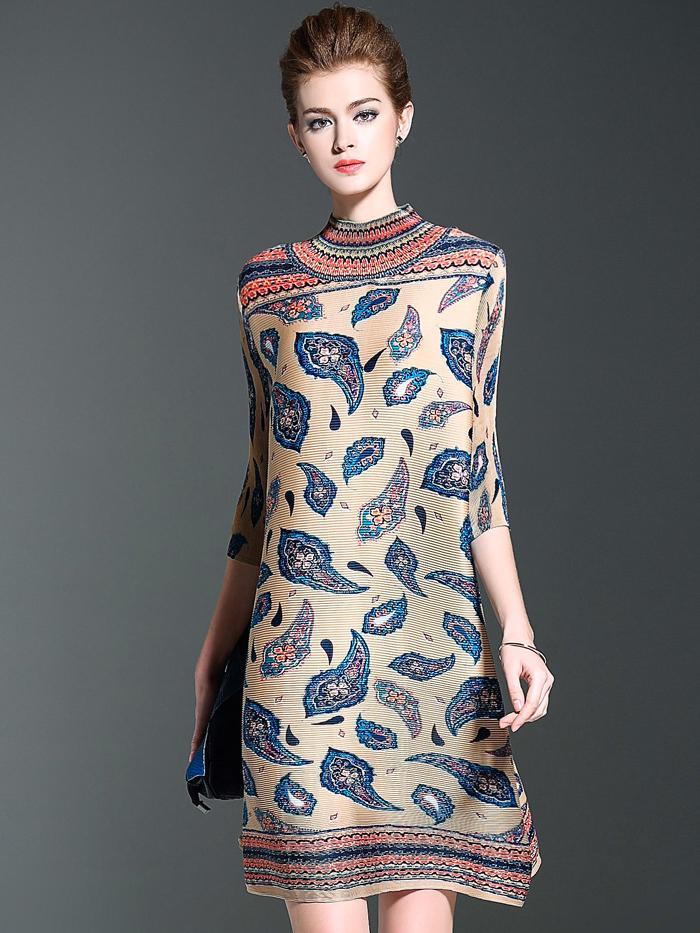 Fashion printed three-quarter sleeve loose stretch pleated dress