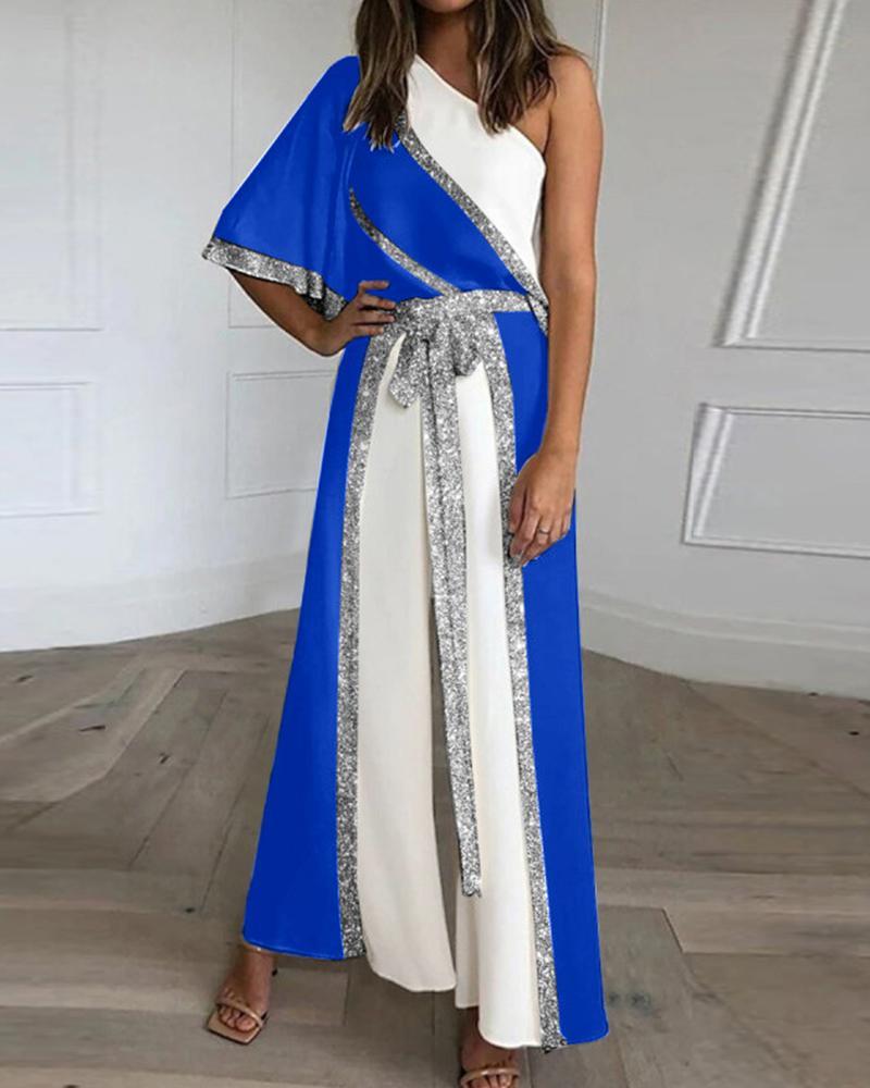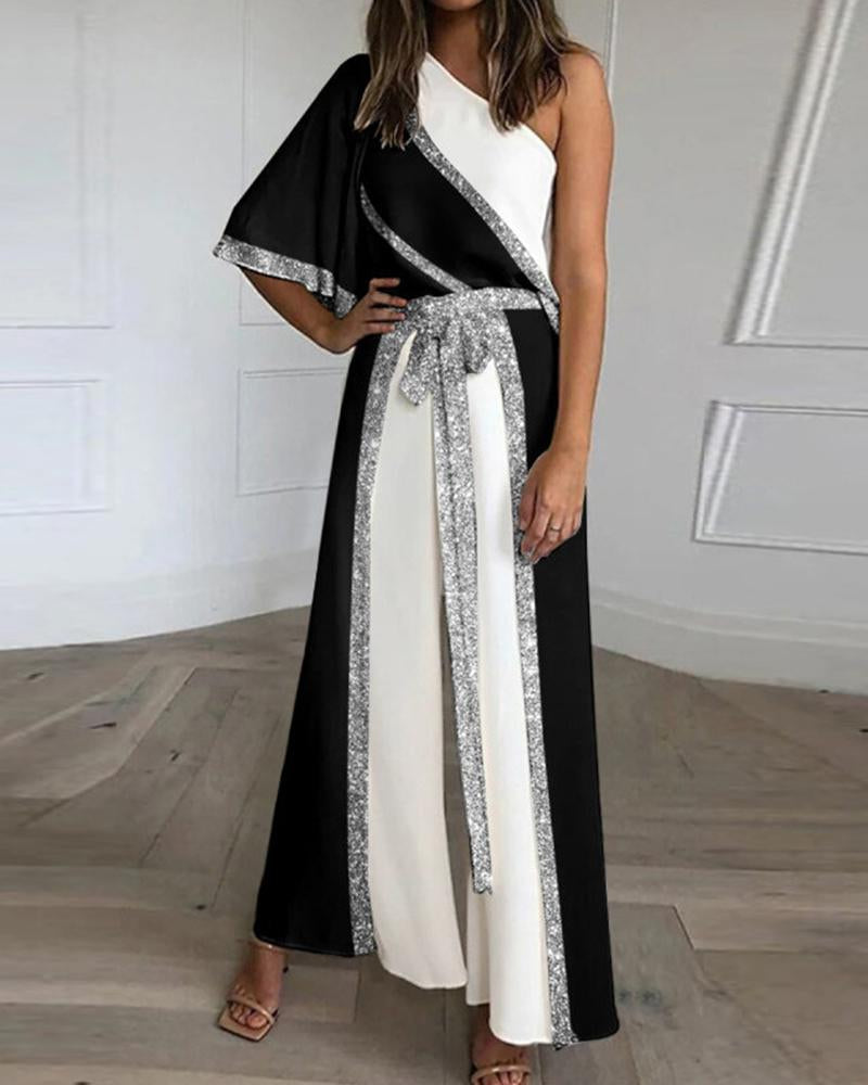 Fashionable Solid Color Diagonal Neck One-piece Wide Leg Pants