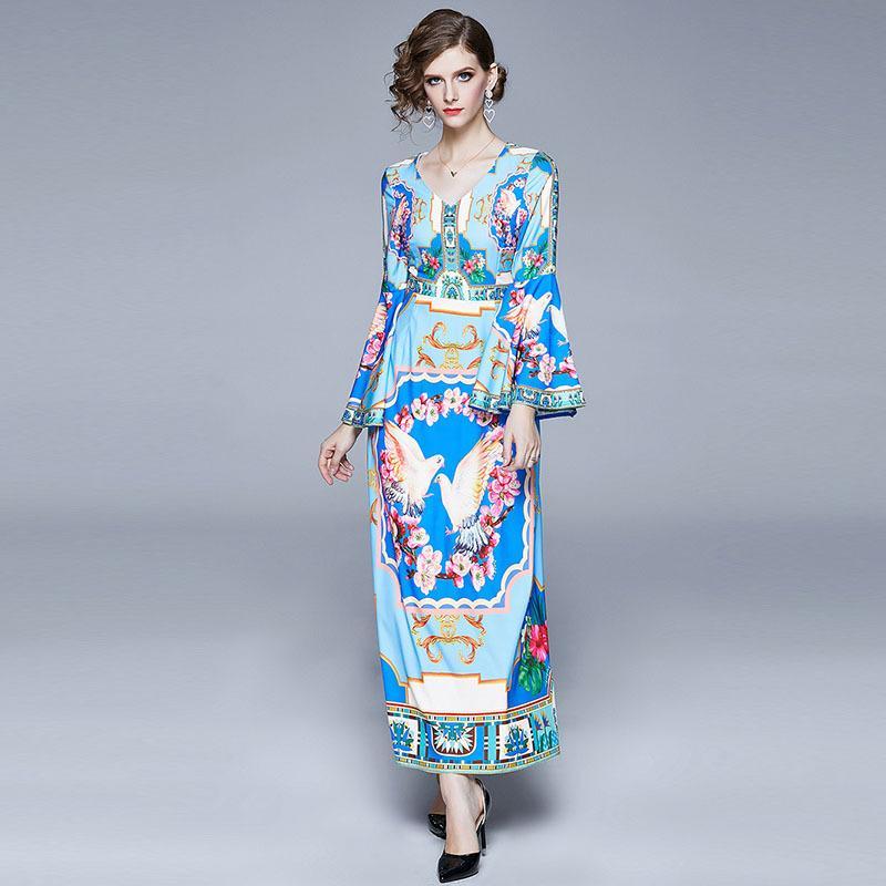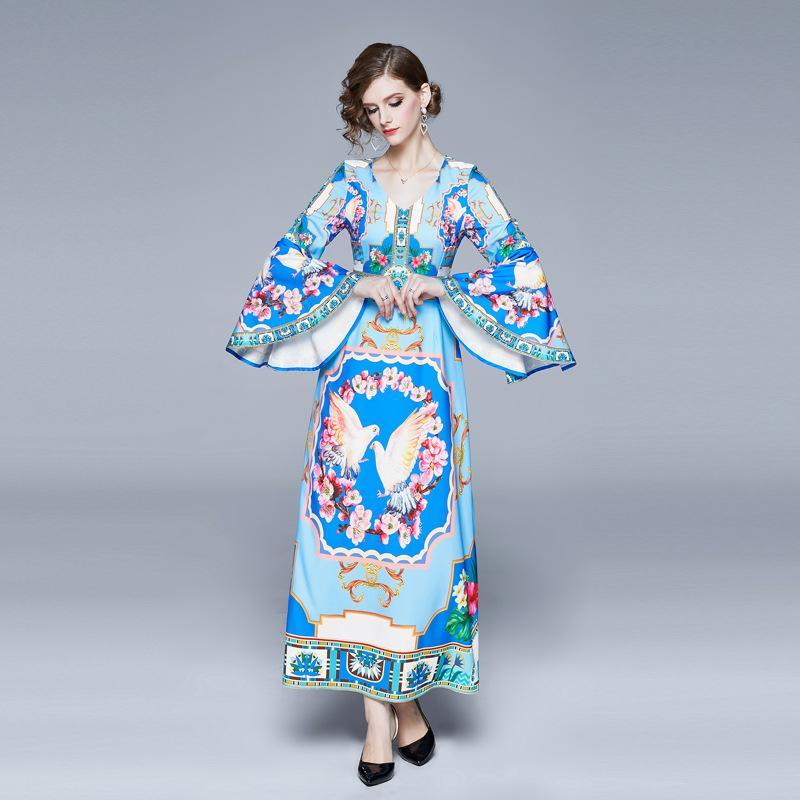 All-match fashion retro exquisite floral bird print V-neck flared sleeve dress