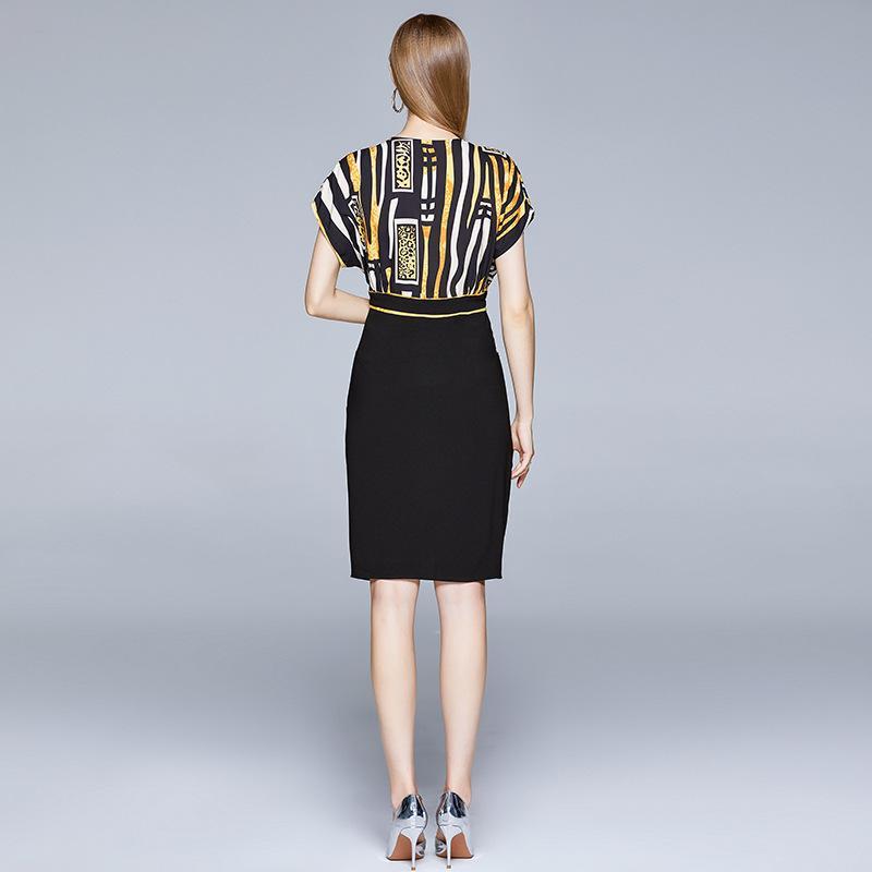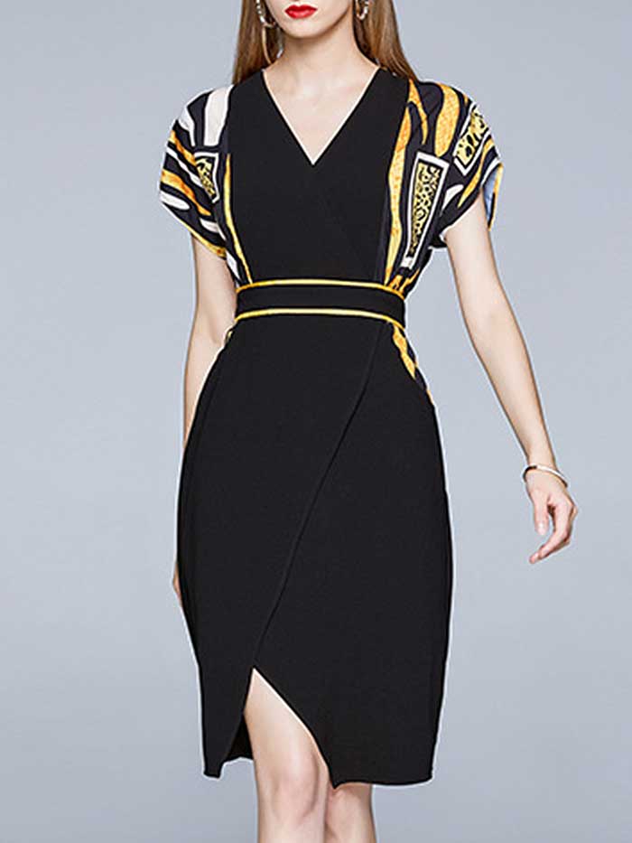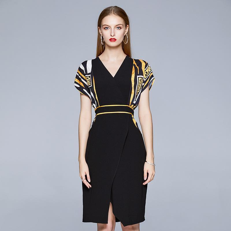 Fashion V-neck Printed Short Sleeve Slim Slit Retro Printed Dress