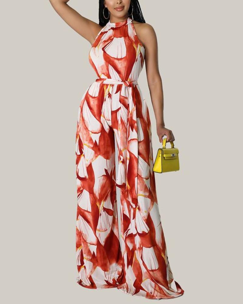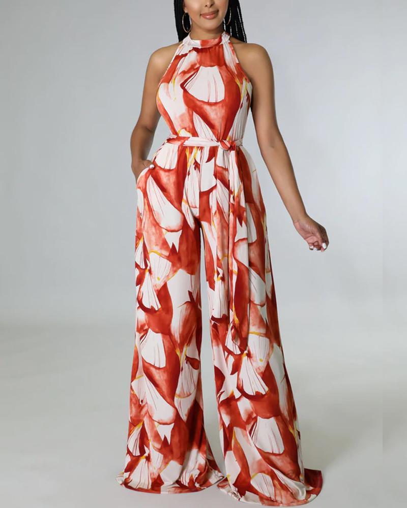 Hanging Neck Off Shoulder Wide Leg Printed Women's Jumpsuit