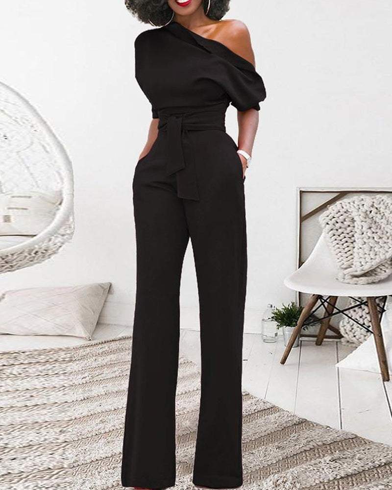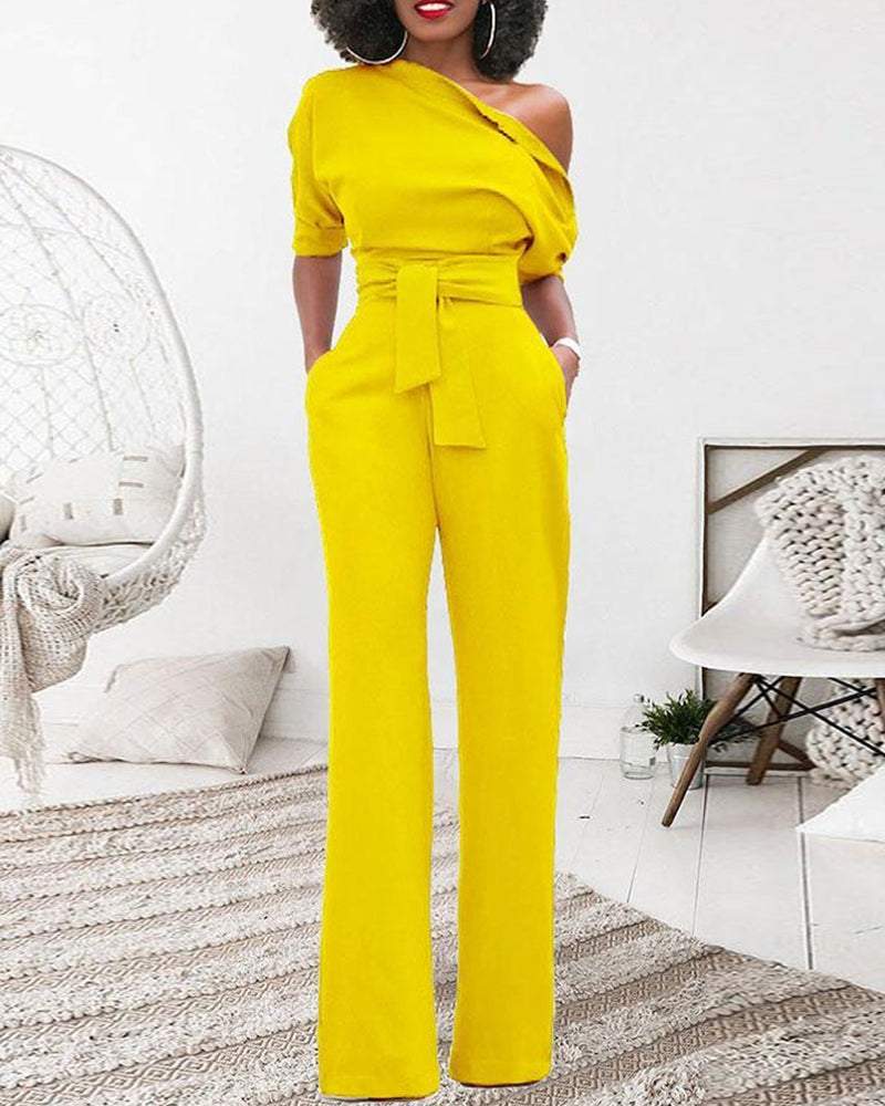 Stay on trend this season in our new stylish. oblique collar jumpsuit. We especially love the solid color fabric and think this piece will be a new favorite in your closet!