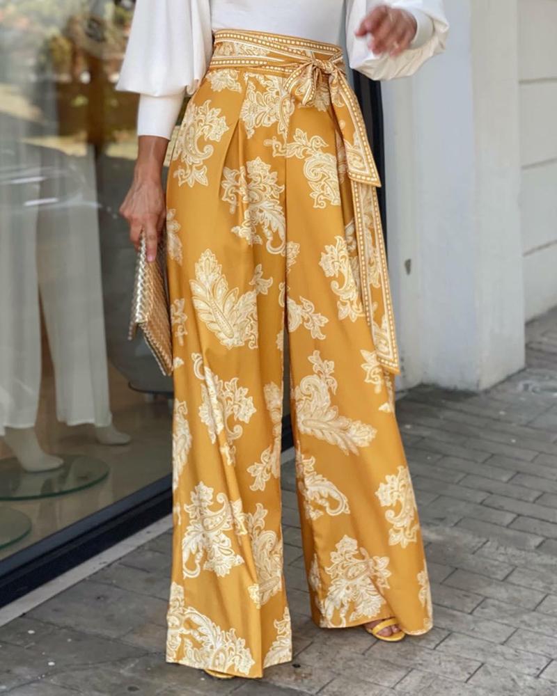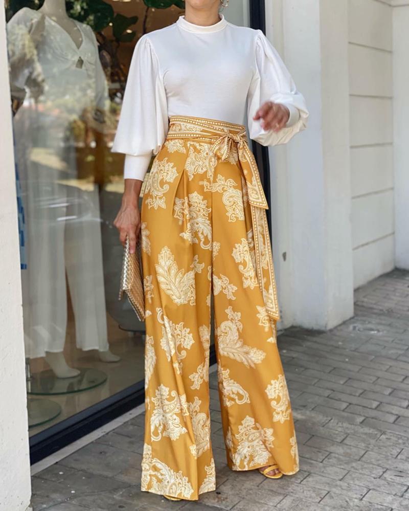 Long-Sleeve Balloon Sleeve Top & Printed Wide-Leg Pants Two-Piece Set