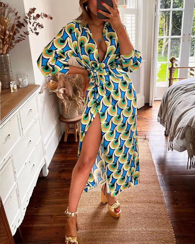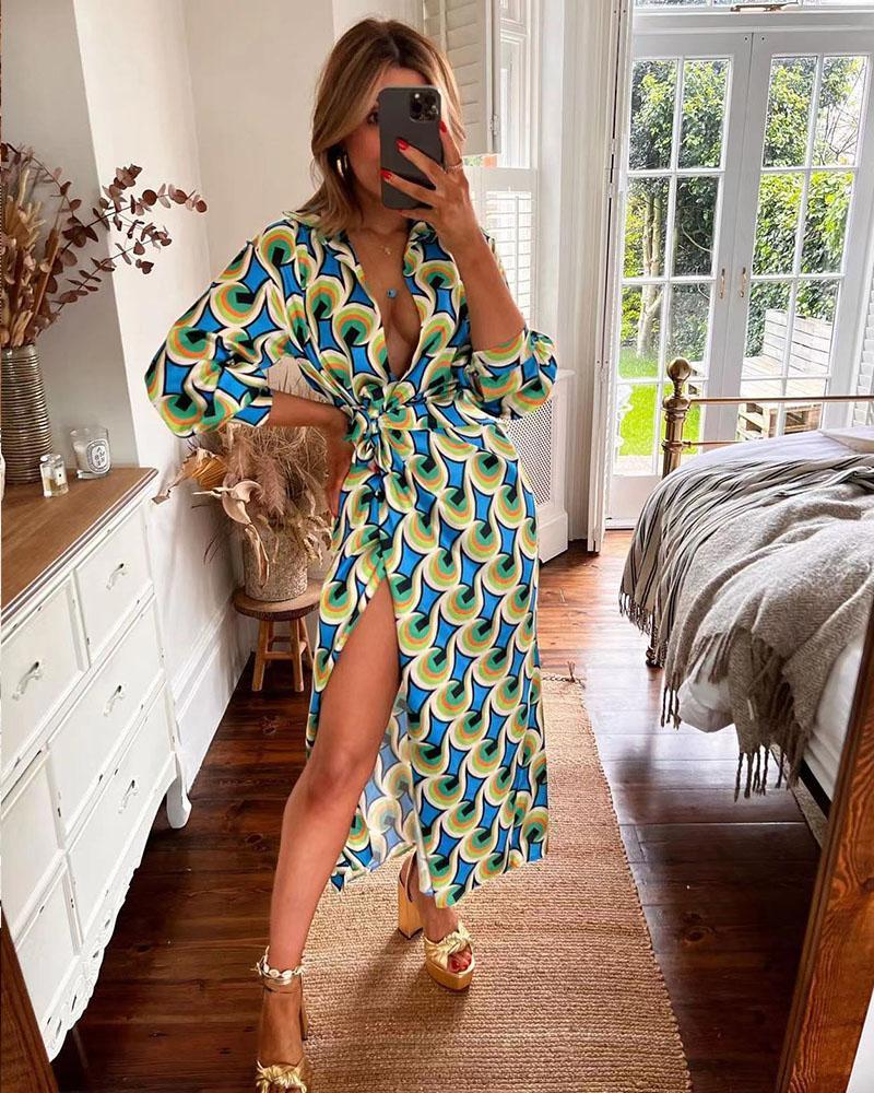 Printed long-sleeve lace-up dress