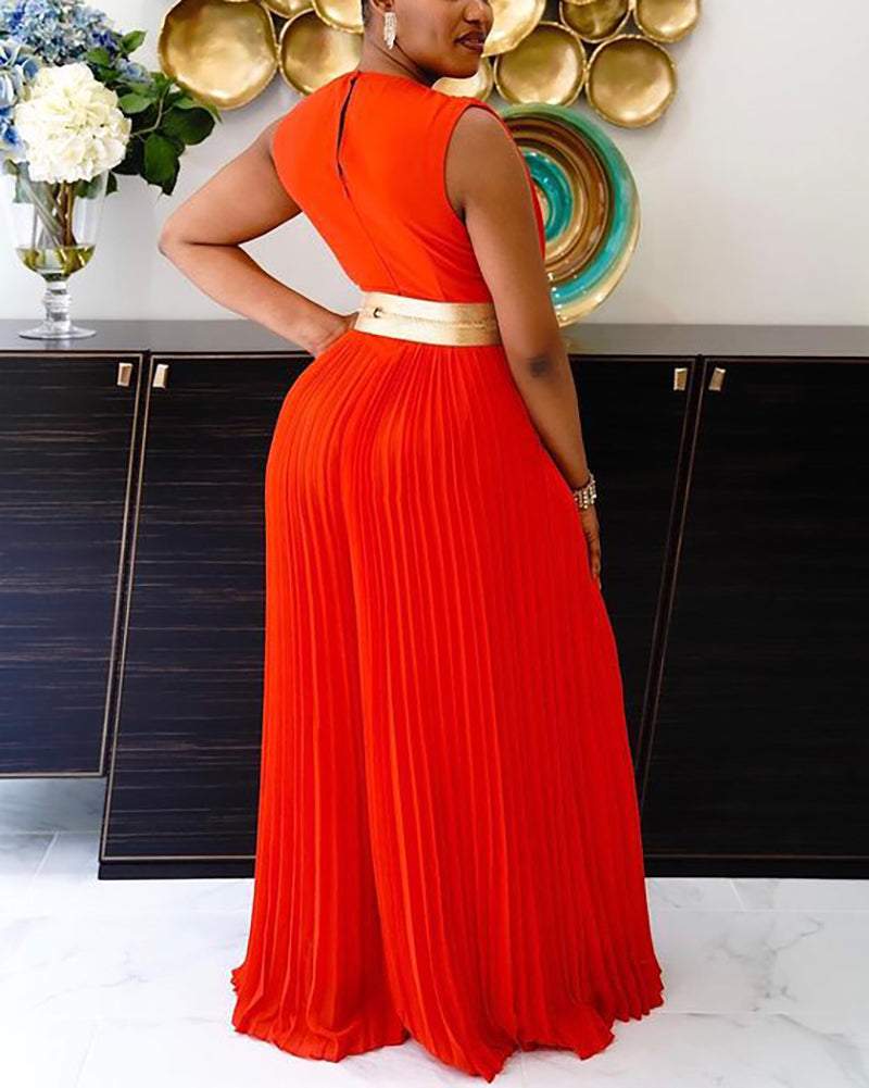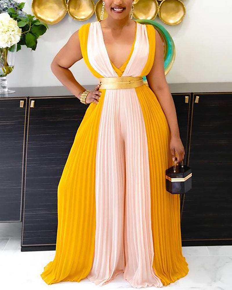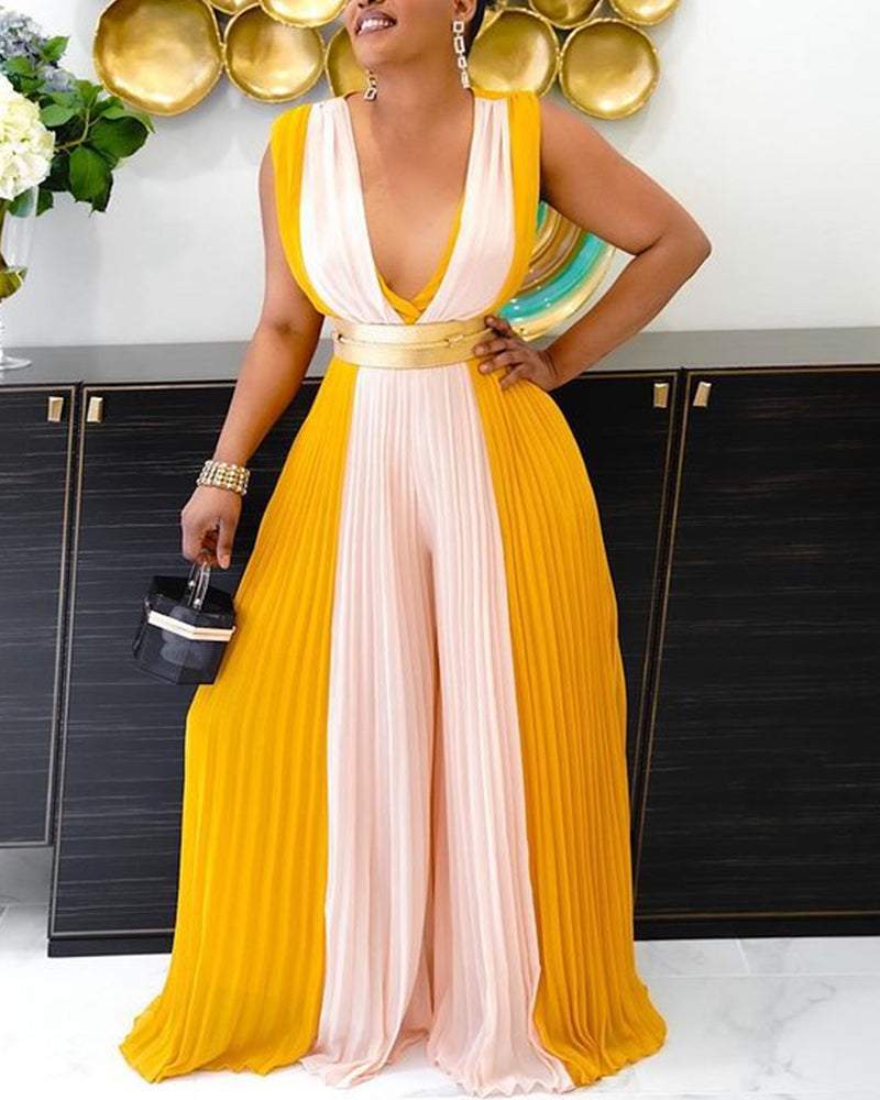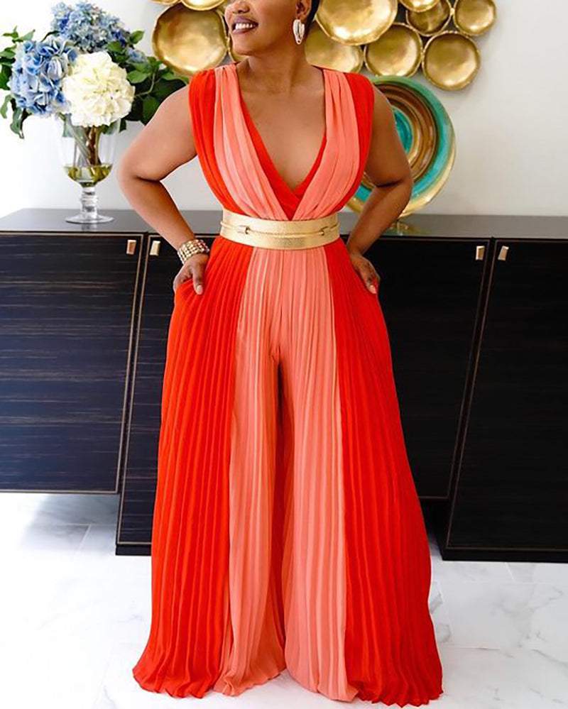 Fashion Casual V-neck Sleeveless Pleated Wide-leg Jumpsuit