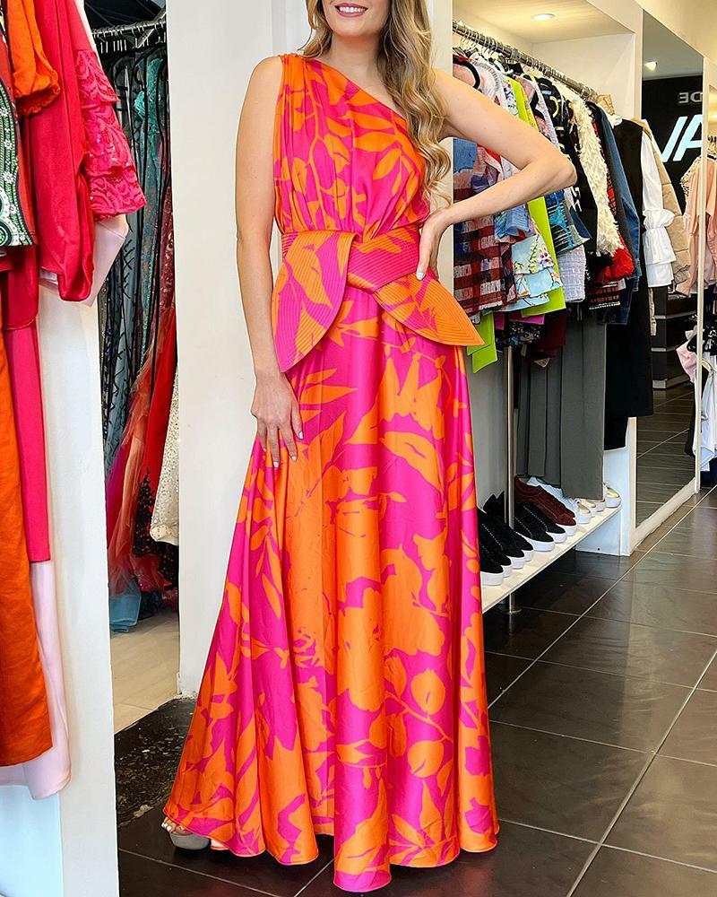 One Shoulder Nipped Waist Print Dress