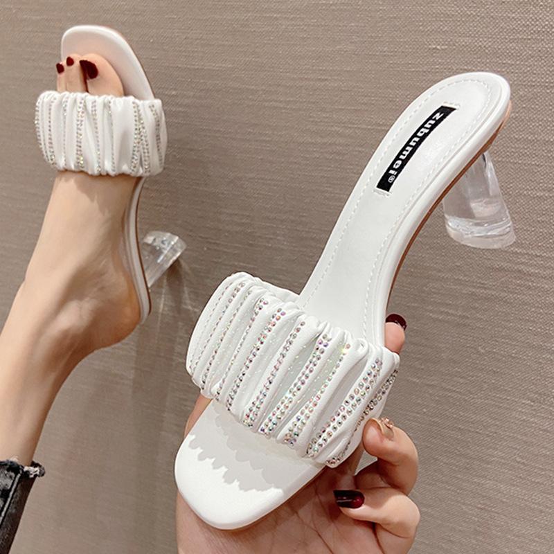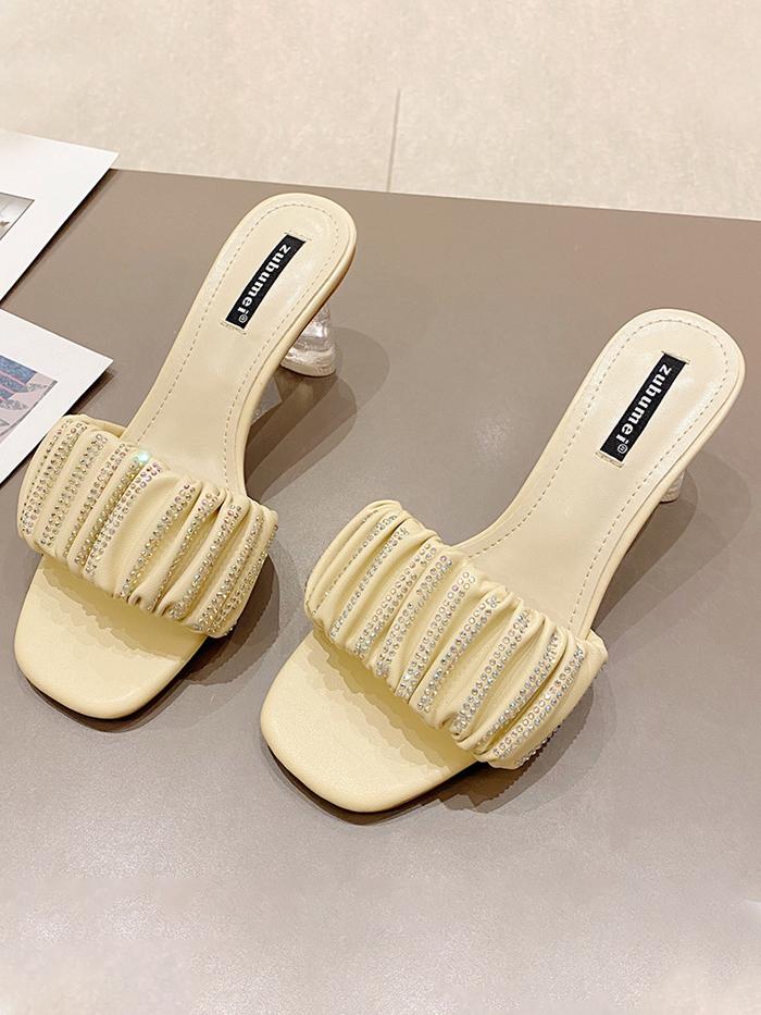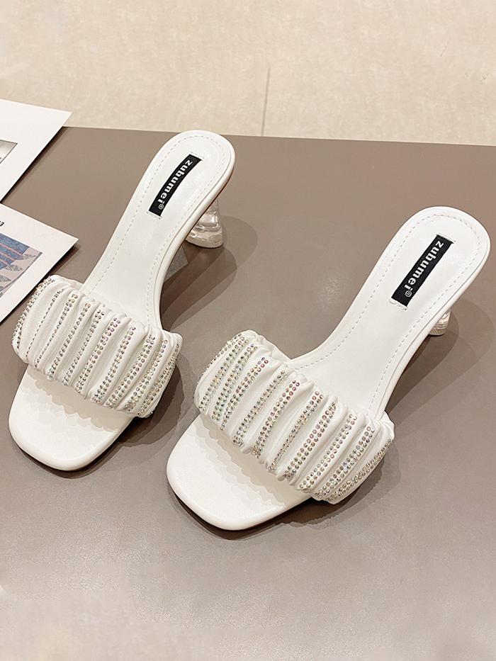 One word with rhinestones high-heel square-toe thick-heel slippers
