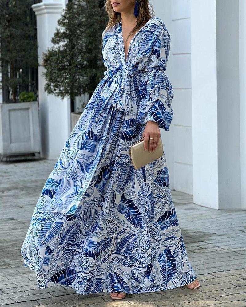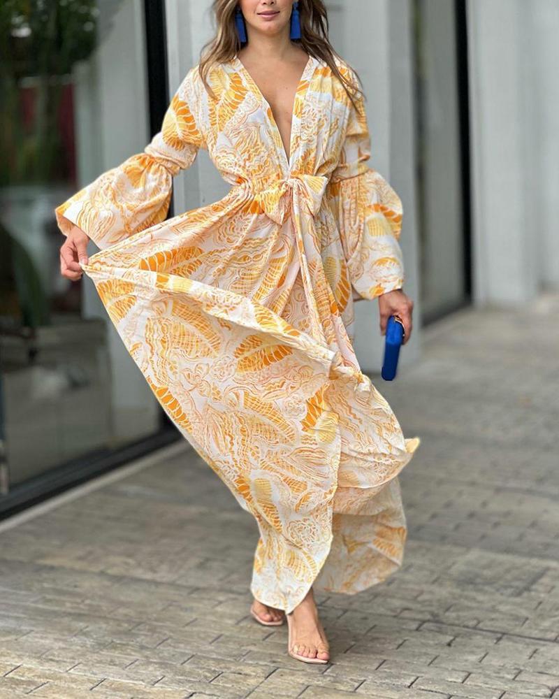 Printed dress with deep V neck and high waist with flared sleeves