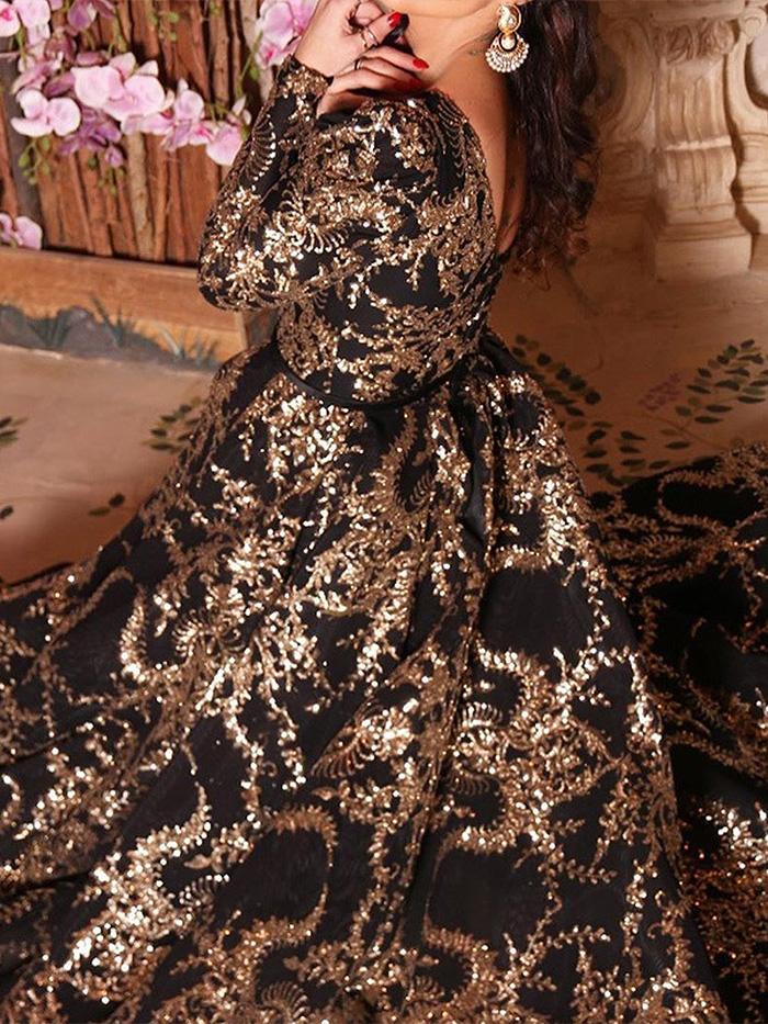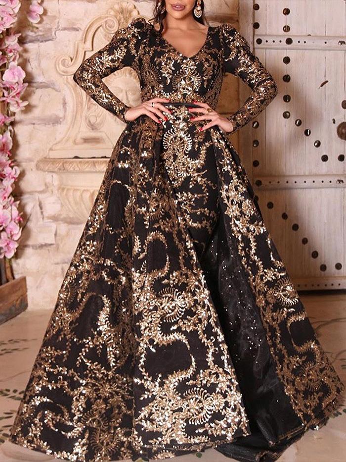 Shiny long-sleeved high-slit maxi dress
