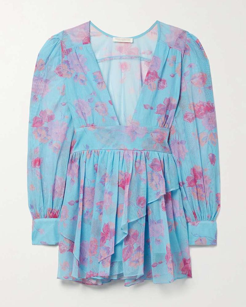 Ruffled floral-print tulle mini dress