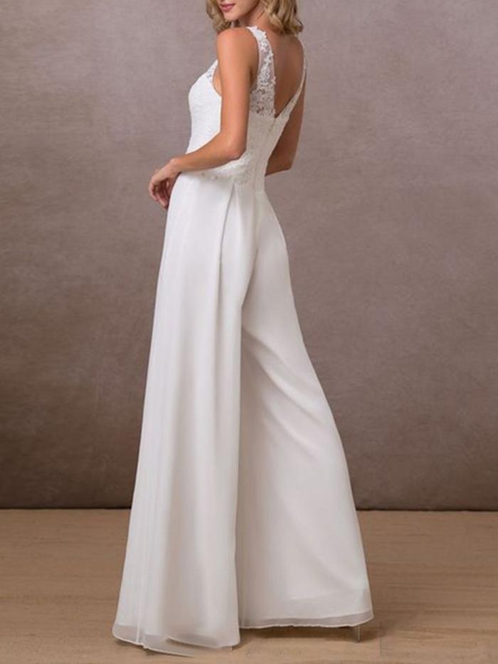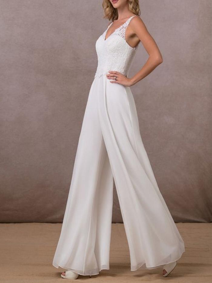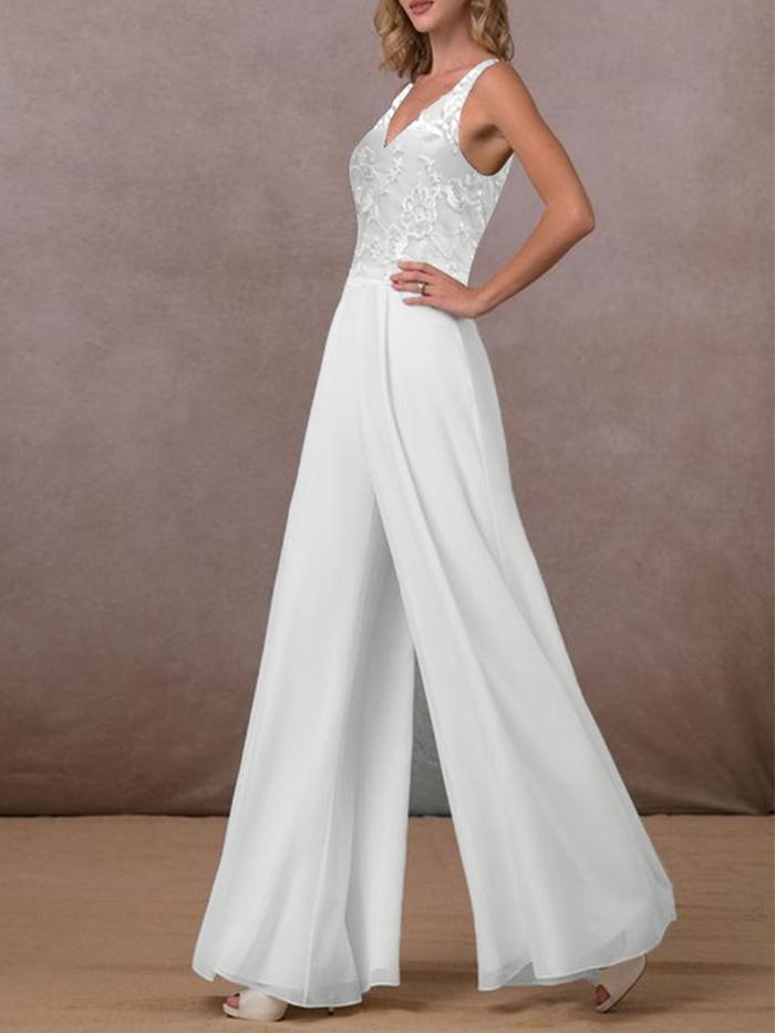 Sexy Chiffon V-neck Mid-rise White Jumpsuit