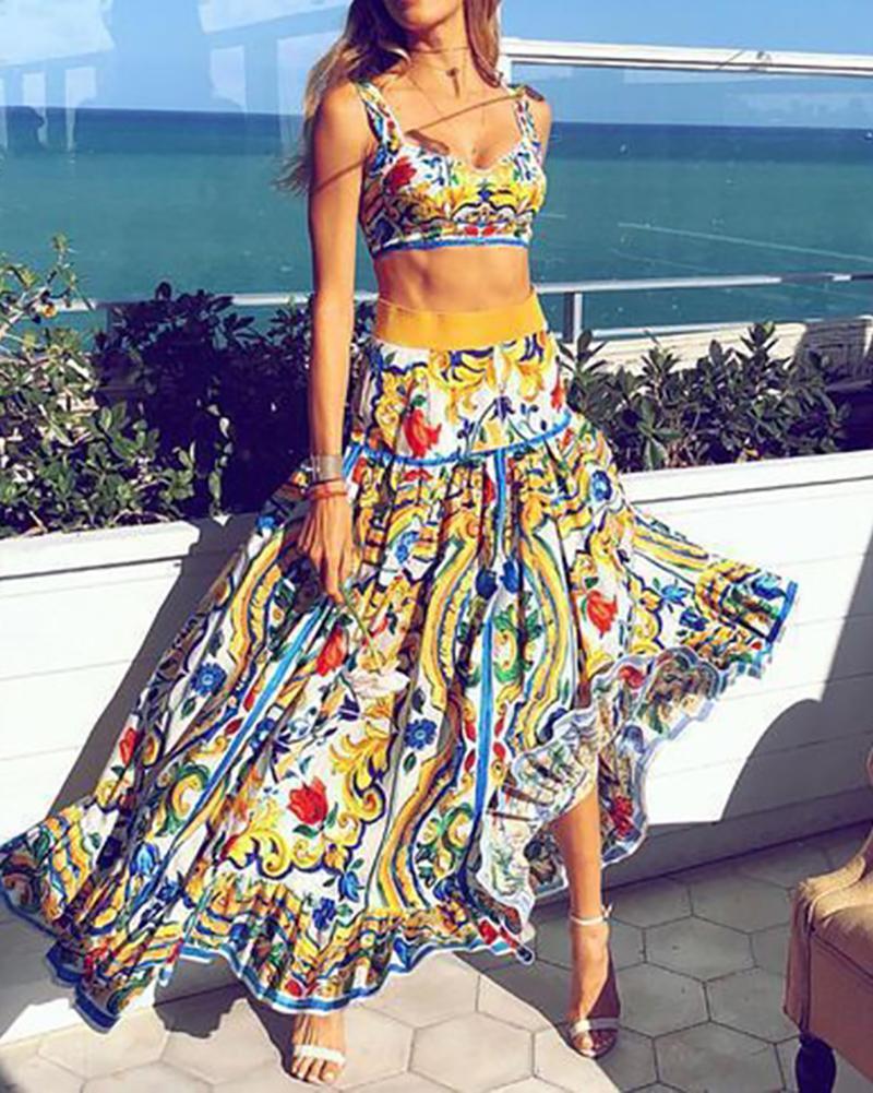 Sexy Off Shoulder Midriff-Baring Floral Printed Top Skirt Set