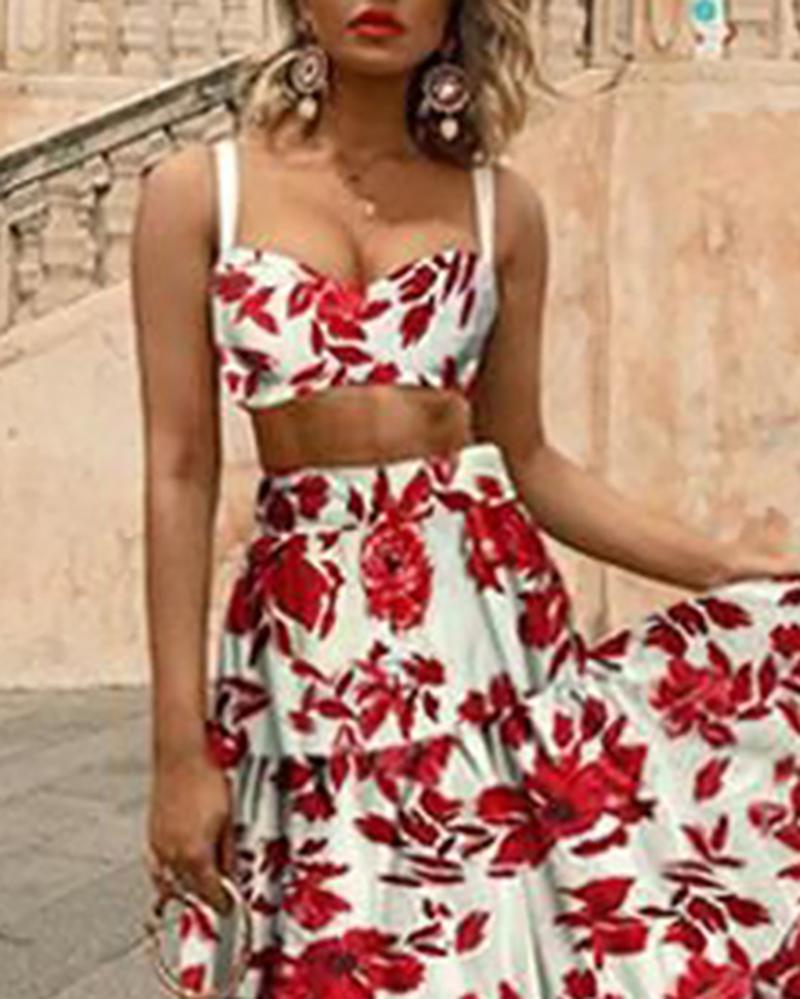 Sexy Off Shoulder Midriff-Baring Floral Printed Top Skirt Set