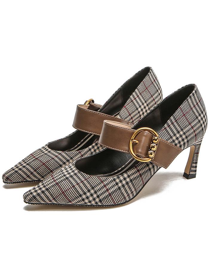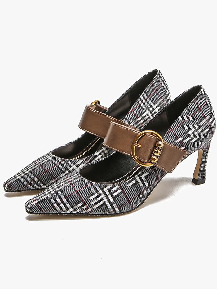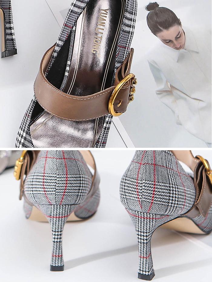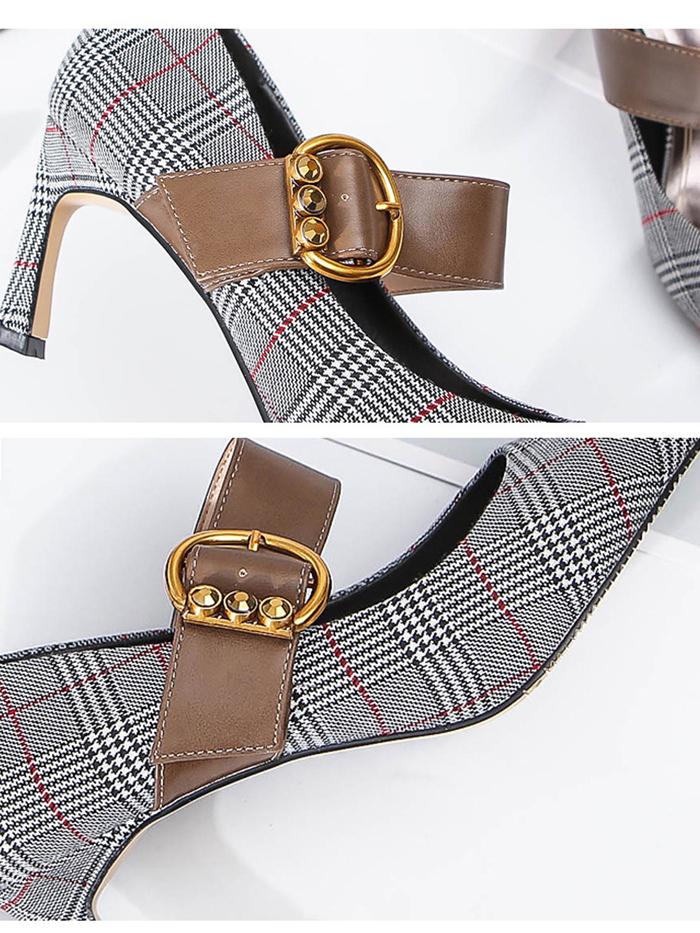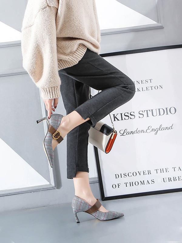Popular elements: grid, shallow mouth, metal buckle, pointed toe, stiletto