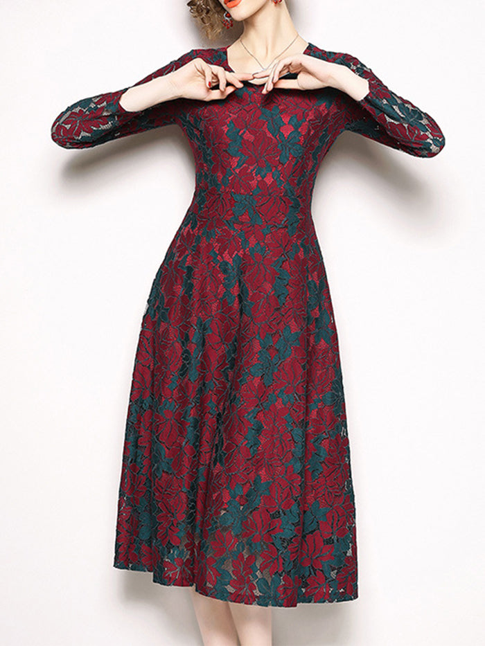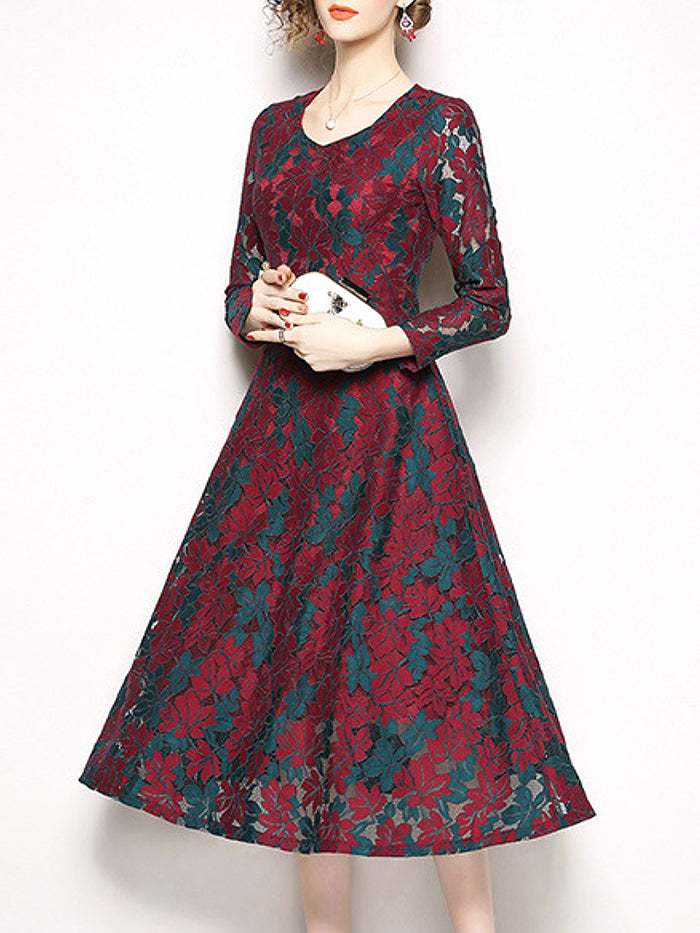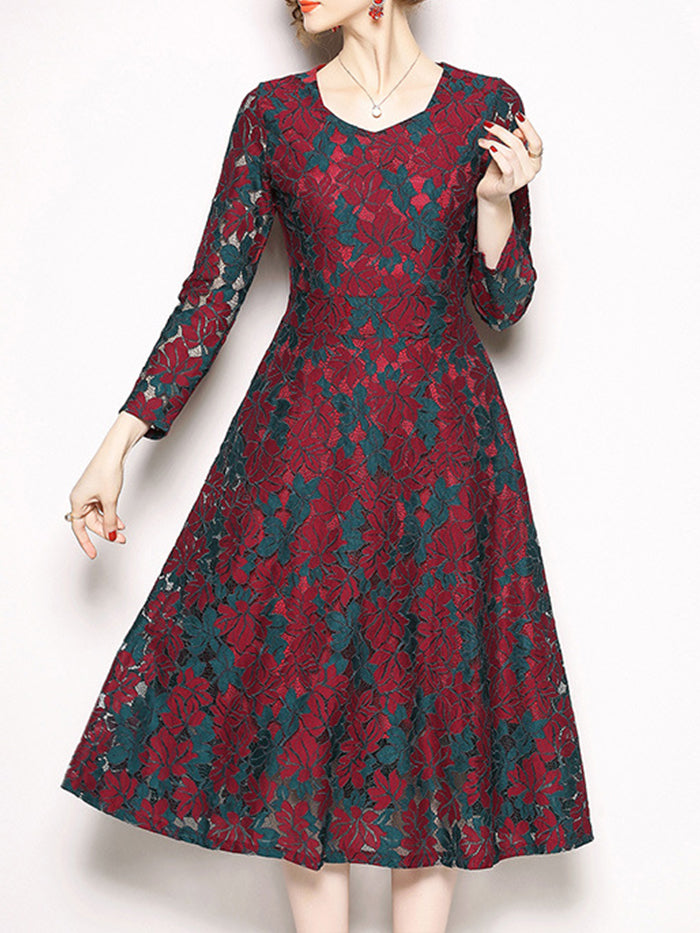 Slim V-neck Long-sleeved Lace Mid-length Dress