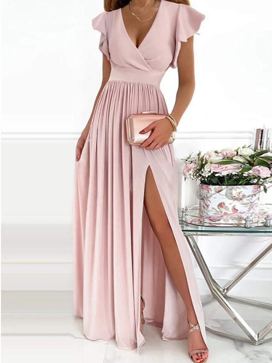 Solid Chiffon Ruffle Sleeve Slit Dress