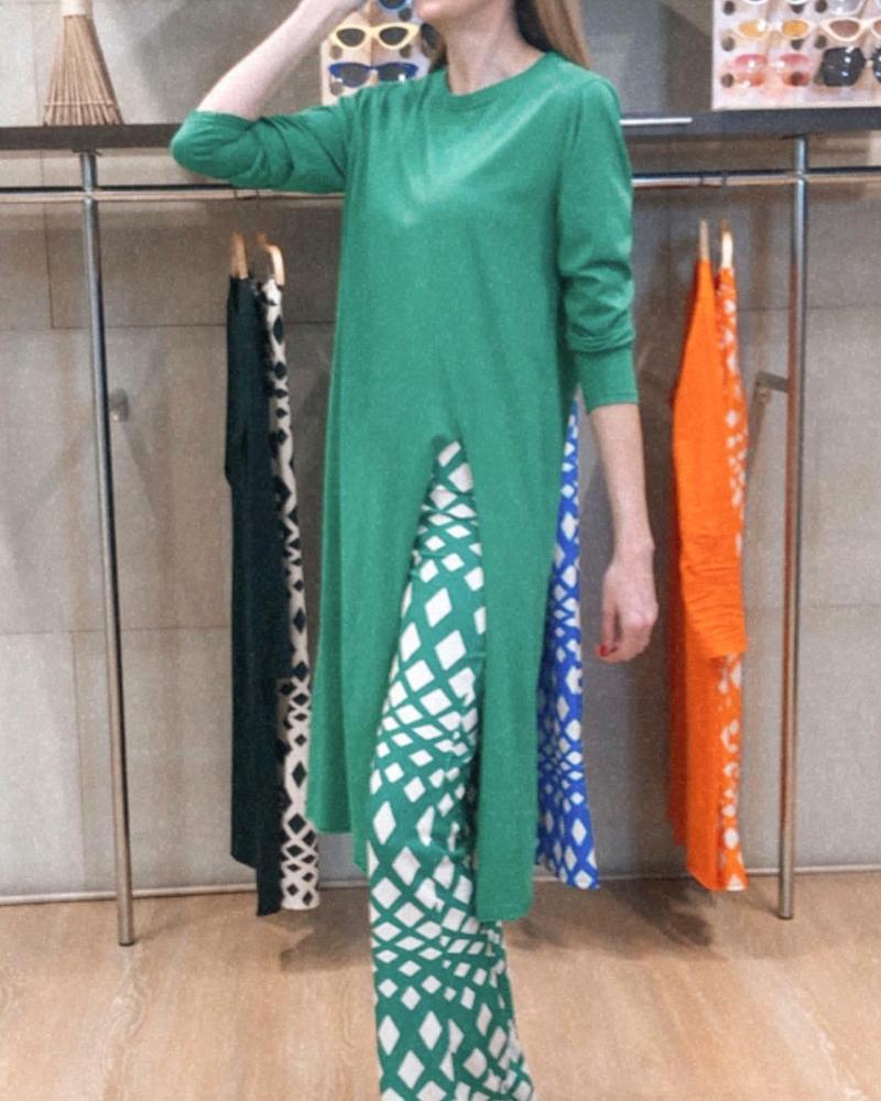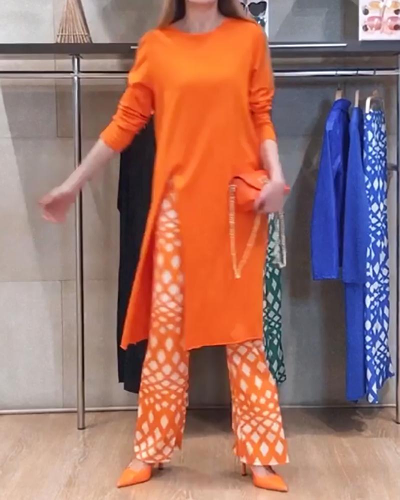 Solid Color Long Sleeve Slit Top & Printed Trousers Casual Two Piece Set