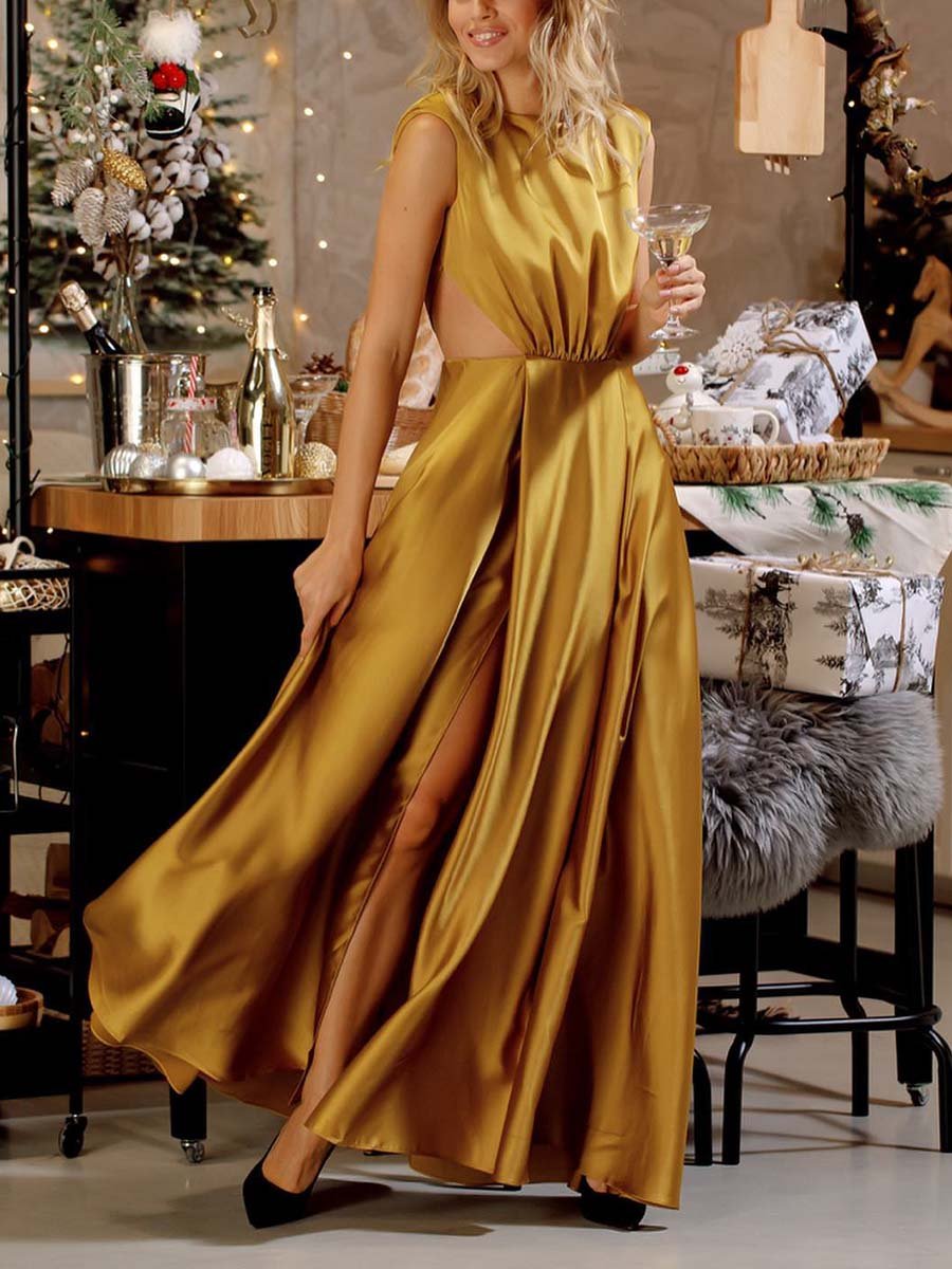 Elegant SATIN Wrap Chest Sleeveless Mid Length Evening Dress