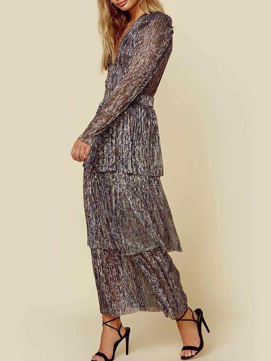 Elegant V-Neck Long Sleeve Midi Layered Dress