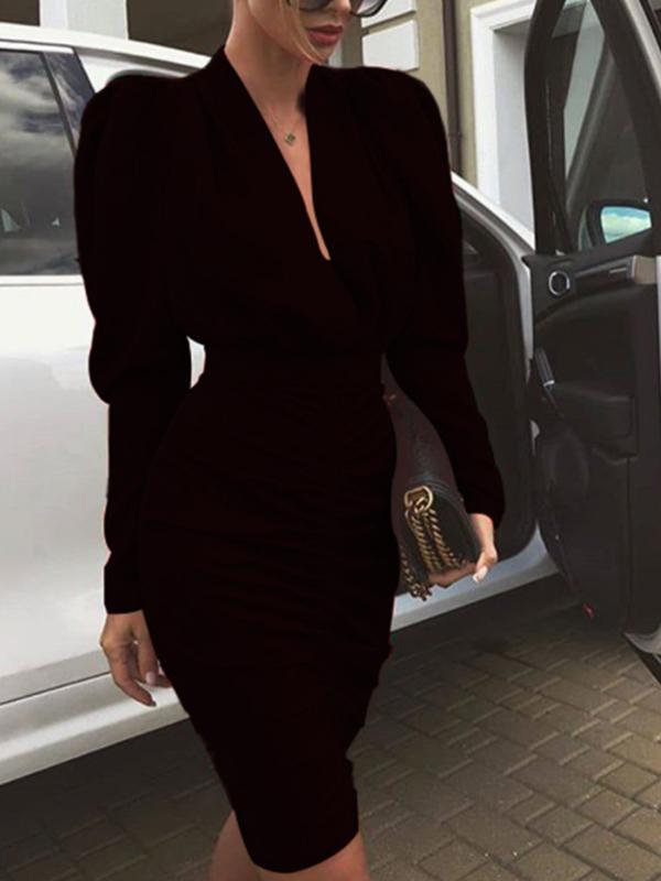 Solid V-Neck Puff Sleeve Midi Dress