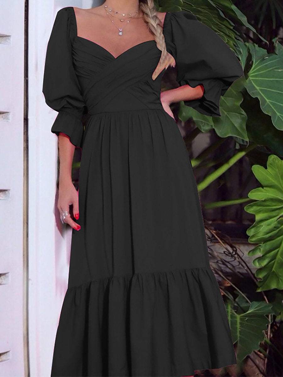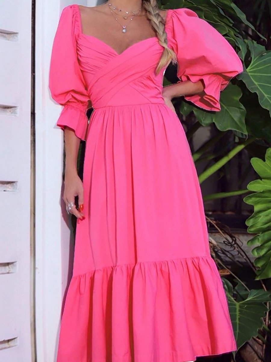 Solid V-Neck Puff Sleeve Midi Dress