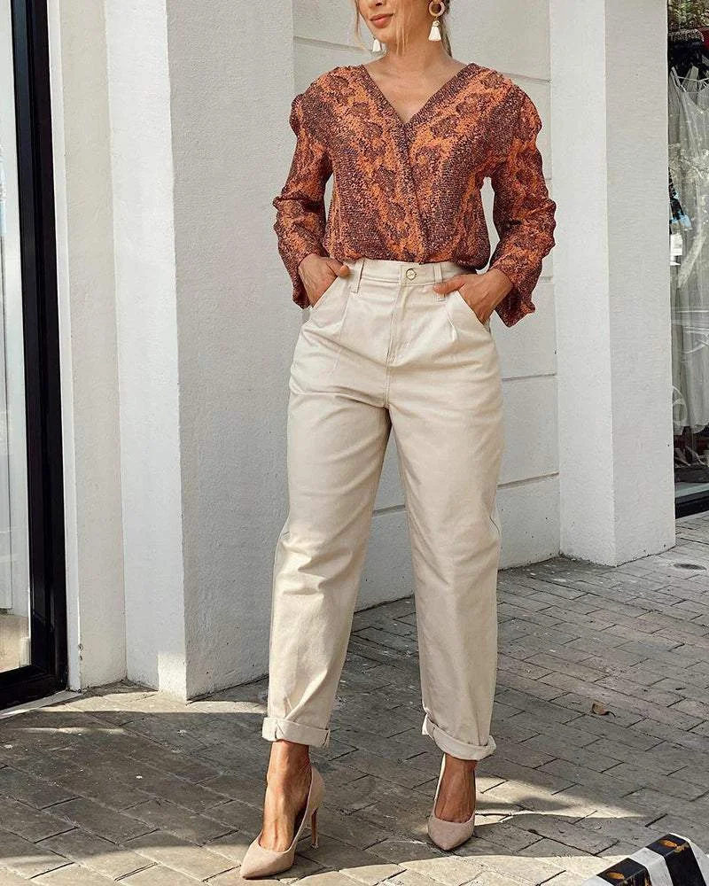 Stylish V-Neck Long-Sleeve Shirt & Pants Two-Piece Set