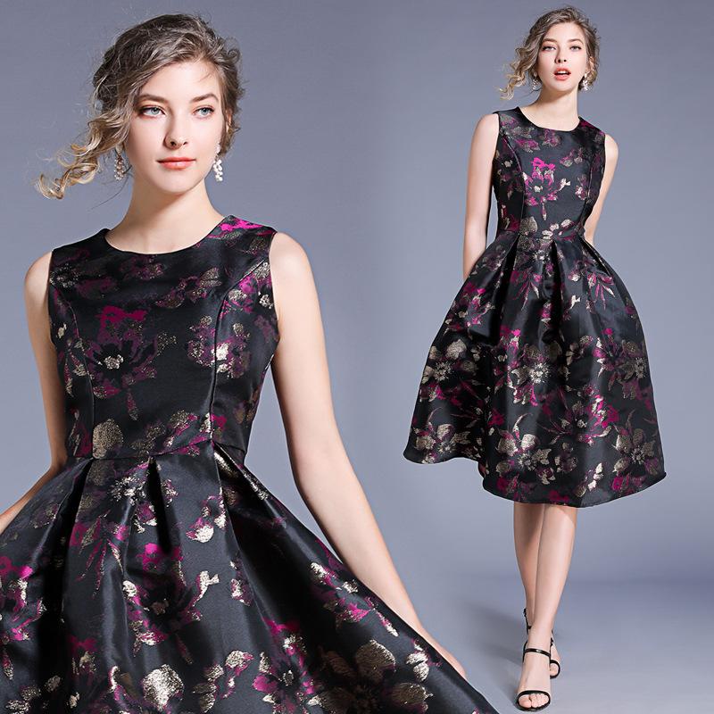 Temperament waist-waisted color sleeveless vest jacquard dress