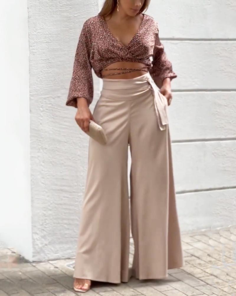 Two-piece set of casual floral top & solid wide-leg pants