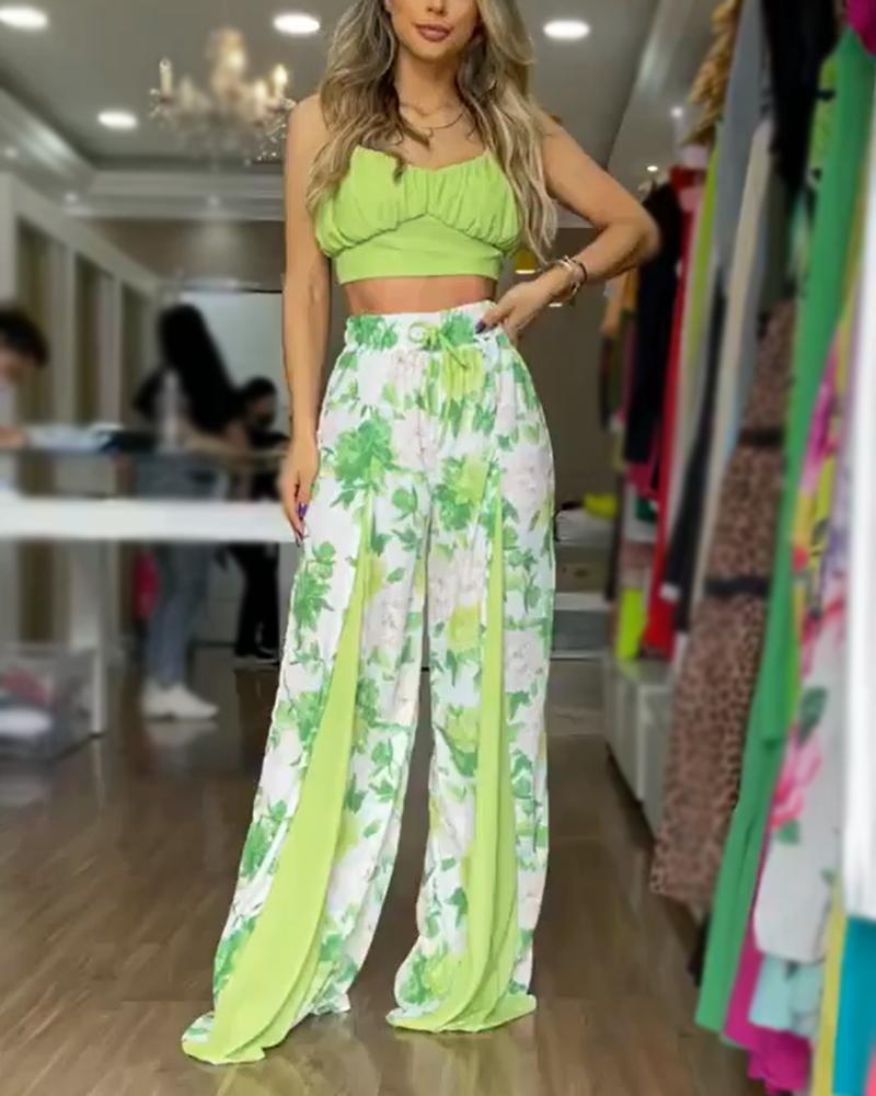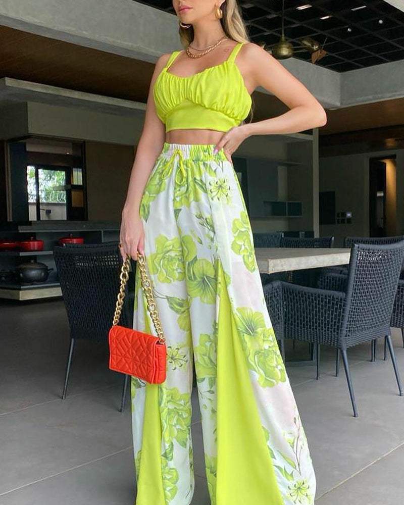 Two-piece set of cropped suspender top & printed wide-leg pants
