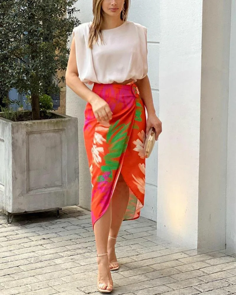 Two-Piece Set of Solid Sleeveless Top & Printed Skirt
