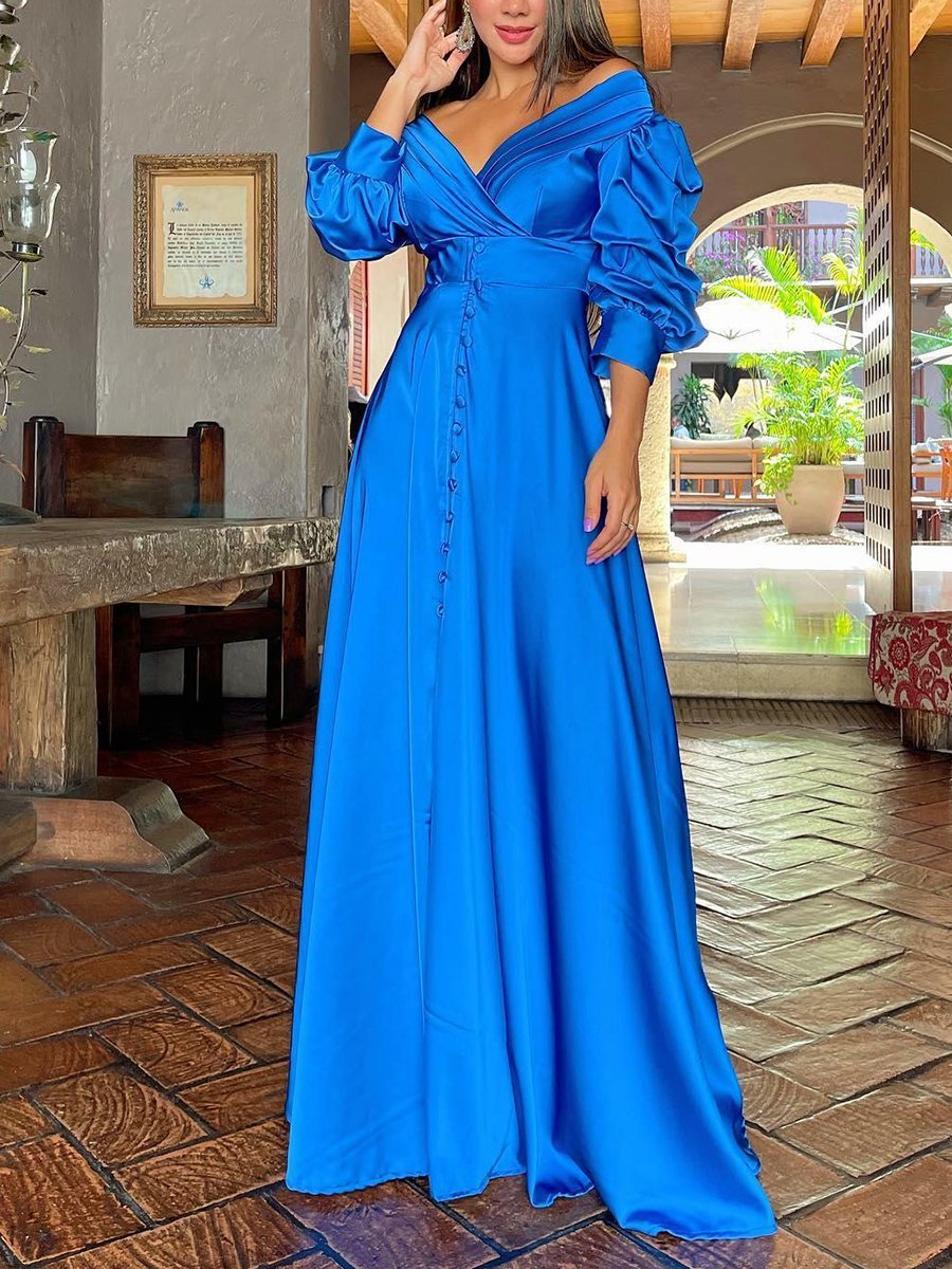 Solid V-Neck Puff Sleeve Midi Dress