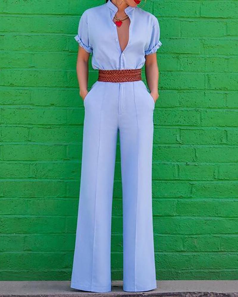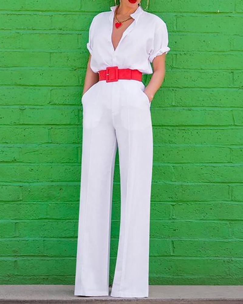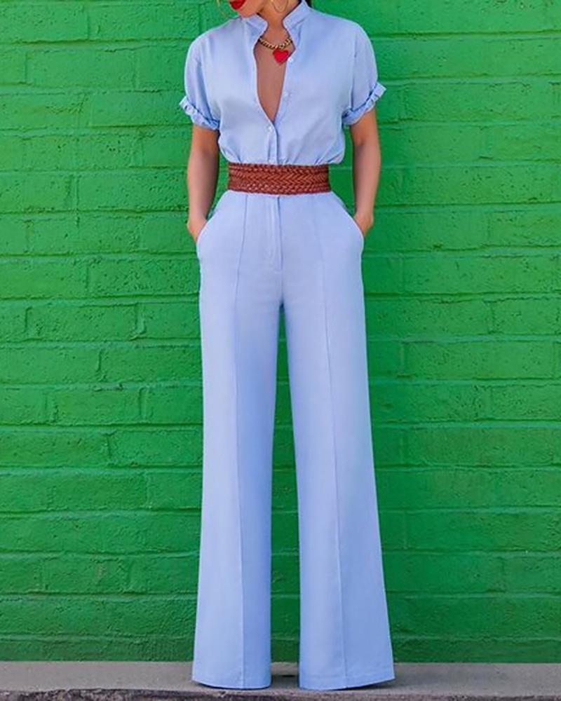 V-Neck Short Sleeve Solid Color Jumpsuit