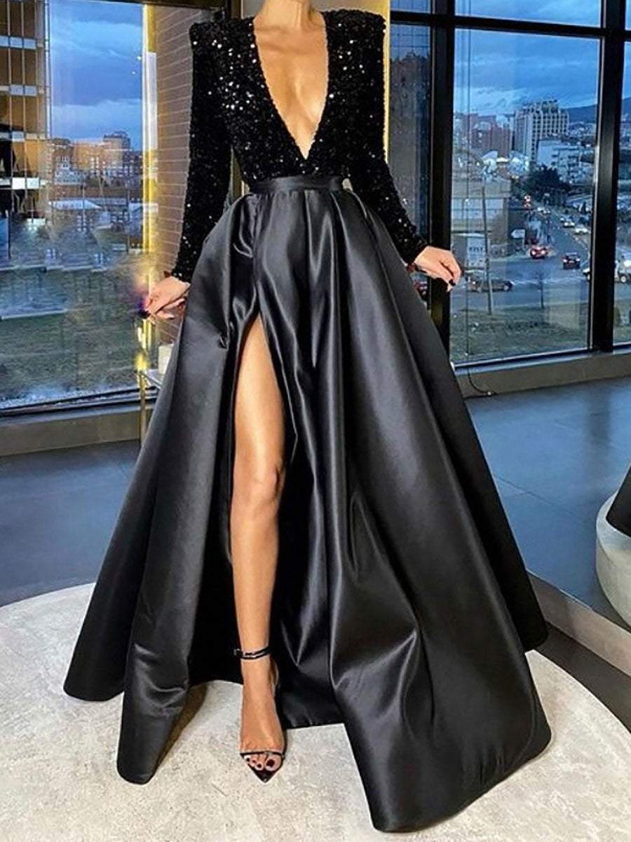 Shiny long-sleeved high-slit maxi dress